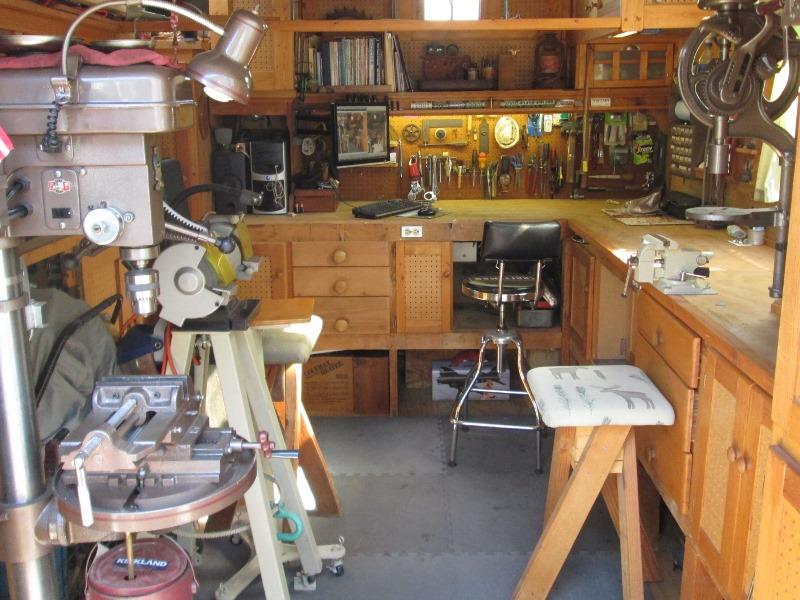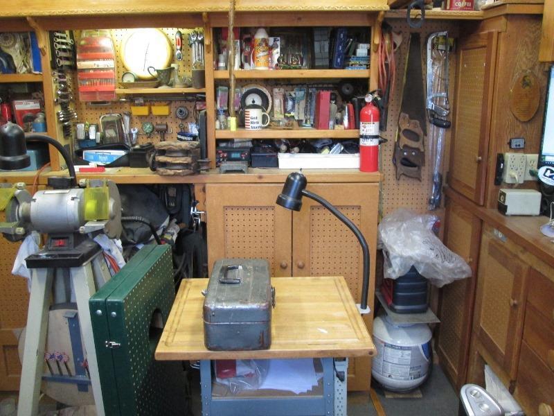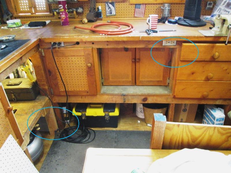 Decided to tap 20 amp line on other side of shop, it feeds drill press (just out of view to left) then a plug for grinder on rear bench where orange cord is. There's a 2" space behind upper shelves and wall and existing hole thru pegboard where line comes in. Be simple enough to run from last grinder receptacle behind shelf pegboard. Ill have to cross front of pegboard where hand saws are to enter under front work bench then straight shot to new compressor receptacle...