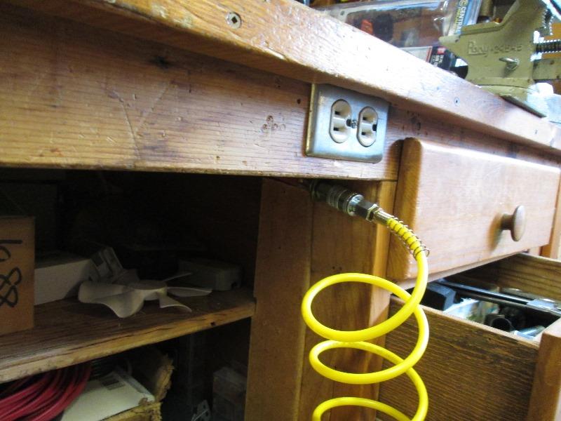 The hose sticking out front gets hit plus hose comes to where I'm using it from the left so kind of in the way, either draped in front of or behind where I'm standing. Adding a Q/C under front of bench, run short hose to plug into compressor.