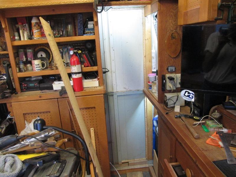 Mounted stop blocks at bottom and 2 magnetic catches at top ( above tool box height). Trim door to fit inside Simple, door back out the way. Boxed in the new plug on left
