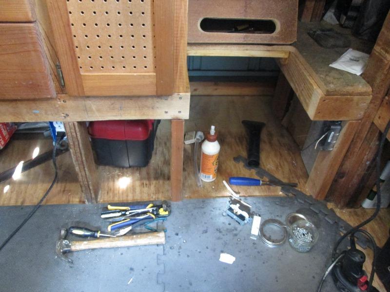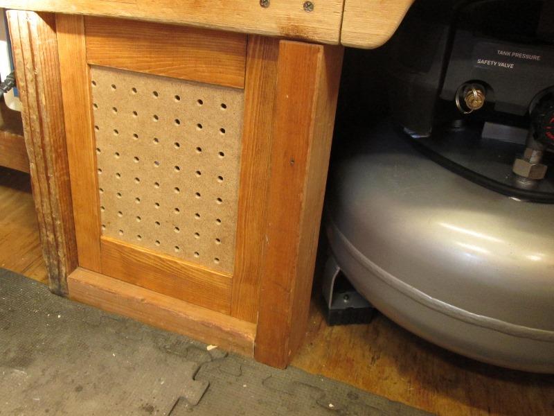 It lives in a lean to just outside shop next to sink, most air needs (cutting/grinding cleaning) are done outside and has worked well. For those occasional needs to run inside shop kind of a pain. Hose draped across deck and inside shop either tripping- getting tangled in cords-just doesn't work. Having air inside for light use would be awesome. So revisited at what it would take to store in shop. Where to put Modify workbench![]() There are only 2 options, on floor under shelf either at front bench or at the side under the vise. Though I seriously considered removing the compressors handle so it would slide under shelf anywhere, that would defeat its portability. I also considered making a handle that didn't stand as tall, then notch the shelf support 2x4 so compressor would fit. That left as only option under the front shelf as the 3 drawers under vise have a lot of weight and the support cant be cut.