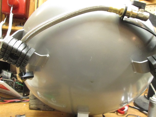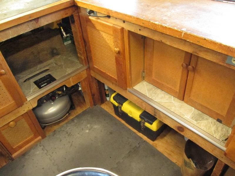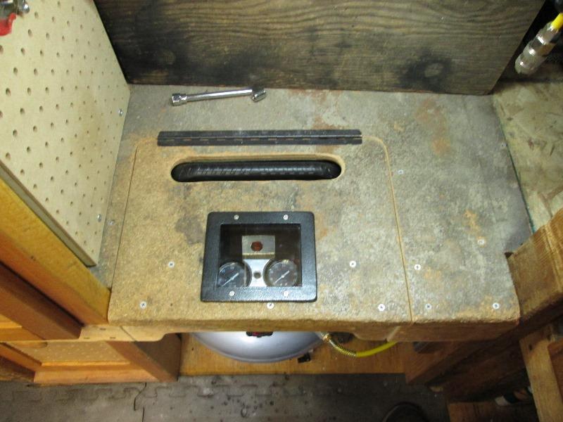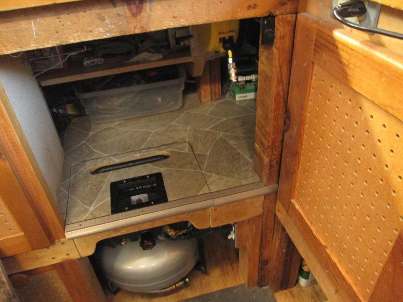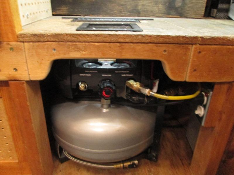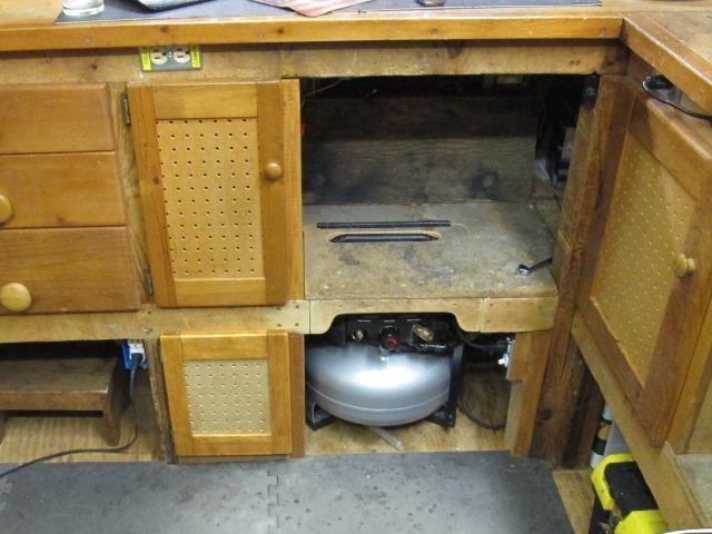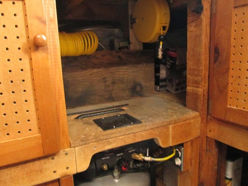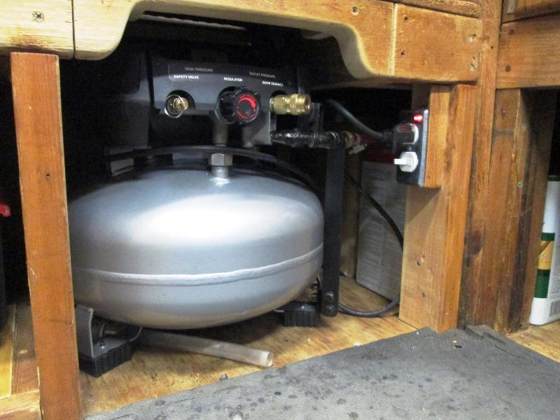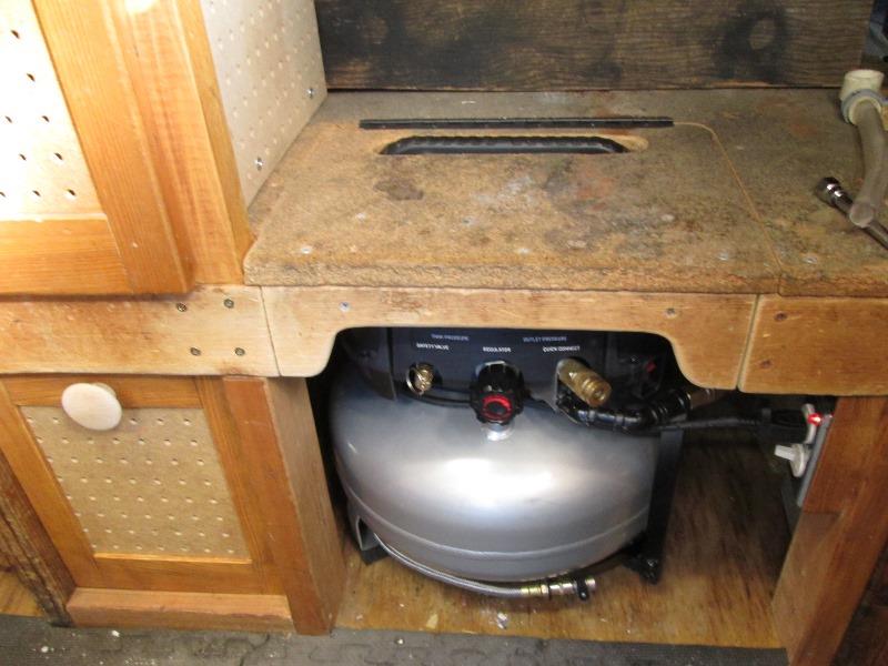 All in all pretty happy although just using and storing the compressor ended up a 3 day on/off exercise. Not planned but resultant switch receptacle for compressor, a floor level receptacle that's tucked back out the way -both on 20 amp circuit. Useable 'hidden' place for storage. Air quick coupler at bench... Kind of fun...Just amazing what was intended just sliding under bench and what i ended up being doing to accomplish... Yet to do is add handle to new door. Drain relocationAll I can address is valve on side. I am going to add elbow and nipple to relocate drain valve toward front.