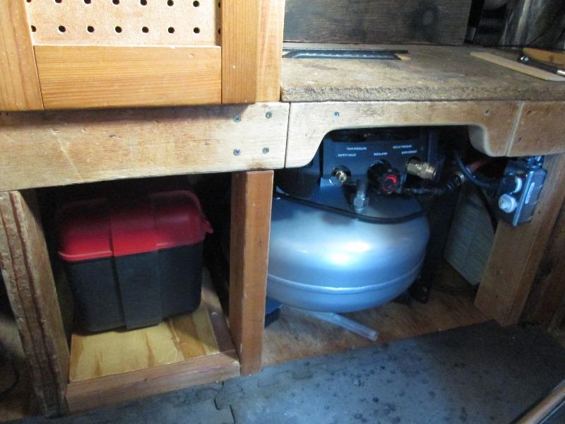 Adding shelf under drawer cabinet would tie the legs so cant move, also be easier to access the air tool box. Make matching door. Modifying the compressor Add bench Q/C
