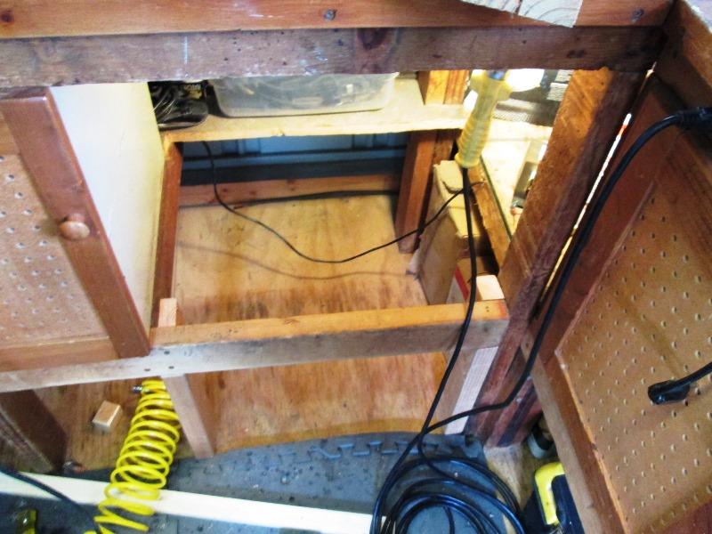 So 20 minute receptacle addition took a good 8 hours. Now that its done.. works slick just reach down and flick the switch. Added pilot light. 2nd tieing bottom of added leg.![]() Using 2x2 between new and old legs to support side to side. Front to back using another 2x2. screwed to each other and floor. Add cut 1x2 on opposite side. 2x2s are cut with notch for planned plywood to set flush.