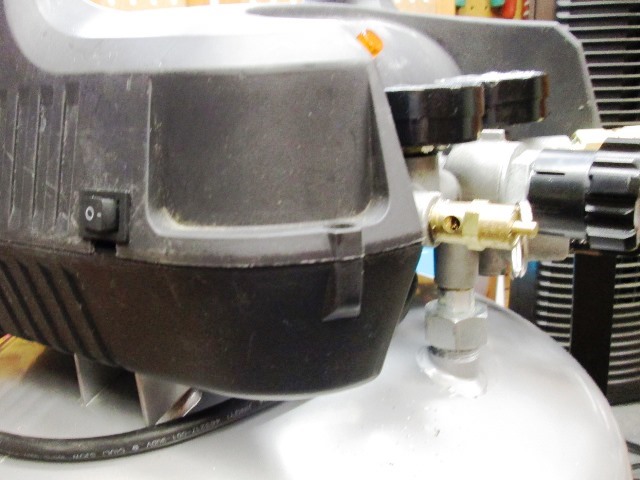Intro-The what & why• Modify workbench to store & use compressor in shop • Modify compressor, add quick coupler to bench • Electrical Add dedicated switched receptacle • Box bottom of added workbench leg- • Door for space between old & new leg • Relocate drain valve • Add low PSI switch, 3-way switch to select 125 or 175 PSI Update 5/2021 • Add gauge 'window' to shelf, opening the lid to see got old • Add 3rd Q/C and air line hose reel, resurface lid Recently had need for a portable air compressor to run nail guns etc to reside a house. Picked up this 3 gallon pancake compressor from Harbor Freight for $120 dollars For the task it worked well and paid for itself. But part of the justification was use around the house/shop where I usually have to run 100' hose to reach stuff. This would work well for those needs. Once I brought it home, put it in the storage shed but soon realized not very convenient- easier to just run hoses. If stored in the shop be handier, if I could find place to store it. Its about 3" to tall to set under workbench. Somewhere in this process I realized if stored inside the shop I could use for air at workbench instead of running hose from main air compressor.