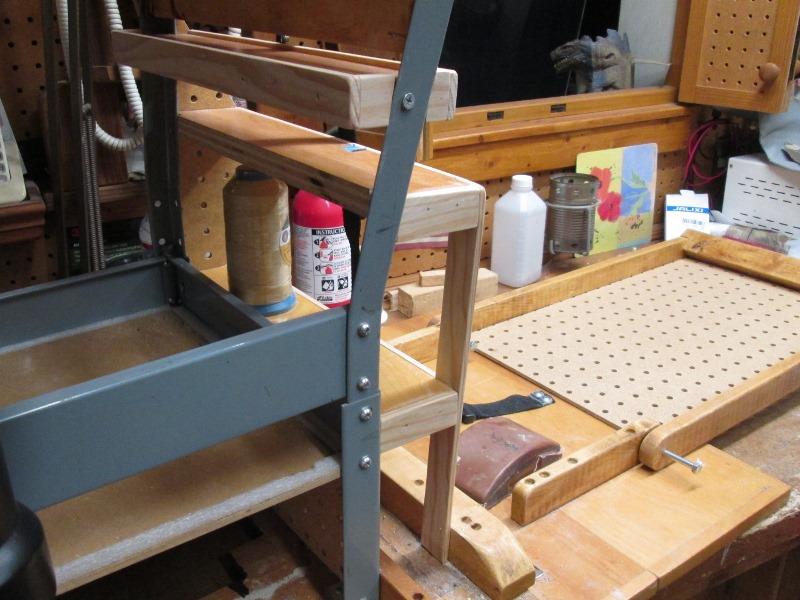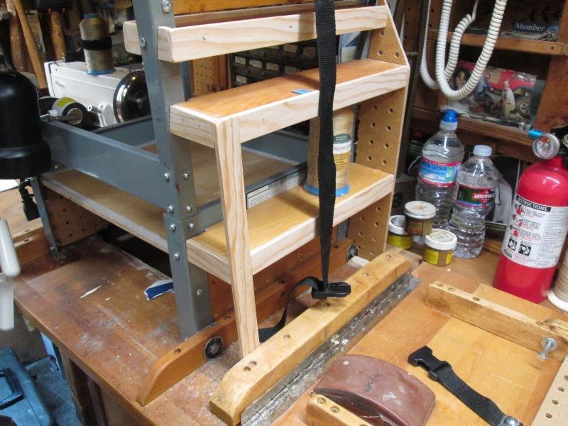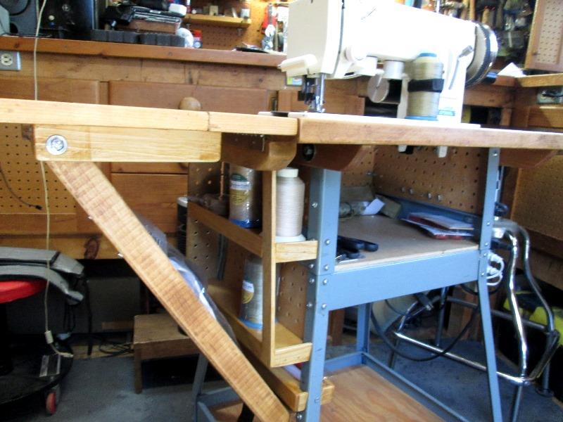 Details: 1.)Finalizing leaf addition to table I had noted area behind leaf support legs at side of table under leaf. Occurred to me I could make some small shelves to store thread spools and other small items, freeing up space on tables main shelf.