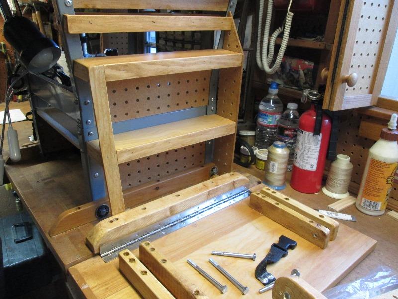 To add full backing to legs it could only cover distance from where legs contact leaf in dropped position. Or recessed into legs for full length to still fold flat. The only restraint as far as adding shelves is when the leaf dropped. Shelves could extend no more than 3" from table. Spools are less than 3" in diameter so that would work, at 5" tall might get 2 shelves. It was raising & lowering table leaf eyeballing shelf addition and leg backing is when I noted how much the pivot bolts were wiggling in holes.