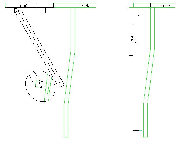 When leaf dropped end of legs will be about 2" from floor. At this point, verifying legs dont extend beyond table legs, discovered left side of table top isn't square to side of table. hmmmm... Not sure when trying to layout how to capture support legs in raised position if this is going to further complicate. (Much later, once table was done& flipped back onto its feet discovered the table top edge I was working off of had been cut-its neither square, straight or at 90°, why stuff off) As it is I'm stuck trying to make whatever captures the support legs. Thought this would be easy. More thought required. The angle of tables legs, leaf will not raise higher than level. It's the really locking once raised. If table could be lifted past level then it could drop into brace on table. Like a french cleat. But it wont and not remaking hinge.