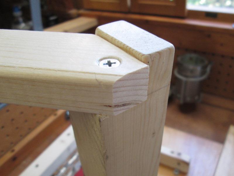 Notched in legs spreader & cut 1x4 for table leg spreader. There's another screw going from back side of 2x2 into legs also glued. And FAIL...