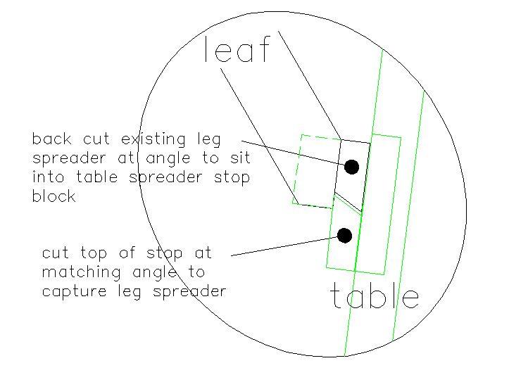 Thought I had it. With leaf leg spreader folded down butting to table leg spreader (as pictured) planned was going to add 1x2 stop across table spreader for leaf spreader to sit on. However rotating legs out the leg spreader lifts 1/2" in the distance it takes to clear stop. Or Leaf needs to be lifted 1/2" higher than resting position to get on or off stop. Not sure how to salvage this.... I had intentionally placed leaf & hinge so when rotated up & level there is no gap between it and table top. IF I cut leaf edge where it butts to table top at hinge, I think maybe 1/8", would give me enough gap to lift leaf high enough to get onto stop. Then IF I can cleat the 2x2 leg spreader and matching stop it would help to contain as that part I hadn't worked out.