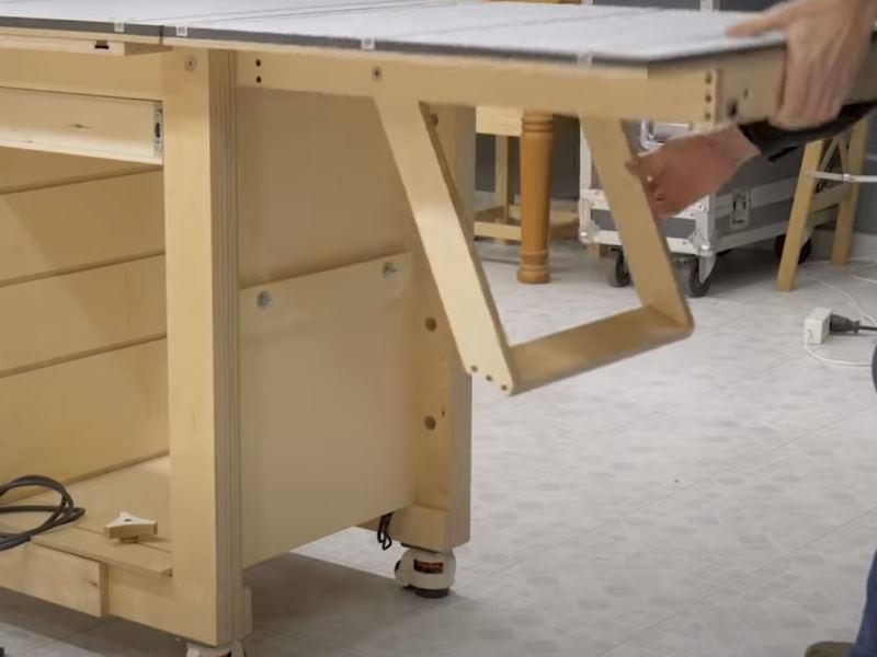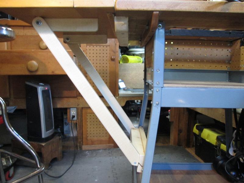 Pondering how to hold leaf open. Looking around on line found several making their own drop leave supports. Mostly under tool table/ garage folding work bench etc. Leaning toward something like this.
