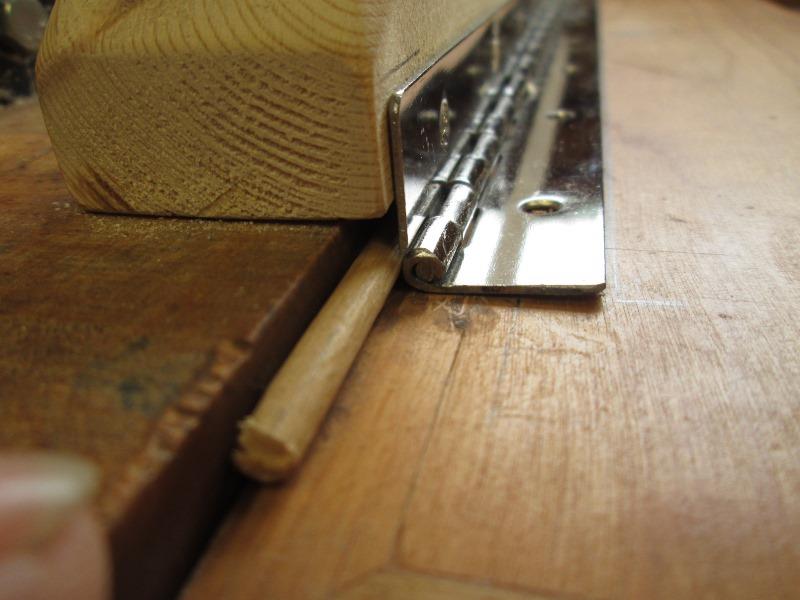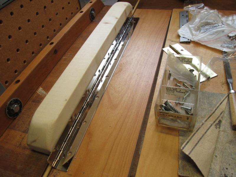 Joining, though gluing and screwing 1x2 braces underneath to leaf I want to ensure face is flush. I don't have accurate way to dowel but I do have vertical jig for table saw. So Ill run slot thru edge and join with continuous piece of 1/8" plywood. Then add support stringers underneath. But first before joining leaf halves is attaching to table. As leaf material is only 3/4" thick I thought I'd just add spacer between hinge and leaf. Issue is hinge holes end up right at joint of face band and plank of leaf. Orientating piano hinge at table edge was not working...