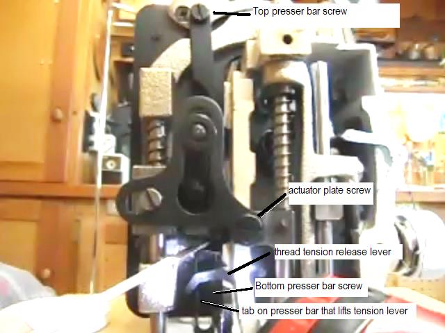 Replacing drop in from top, slight rotating to get behind the tension lever. Tension lever must be between the 2 tabs. Reinstall top screw thru bar with flat washers between bar and lift lever/handle. reinstall bottom screw thru bar slot. Reinstall larger screw thru pressure bar actuator.