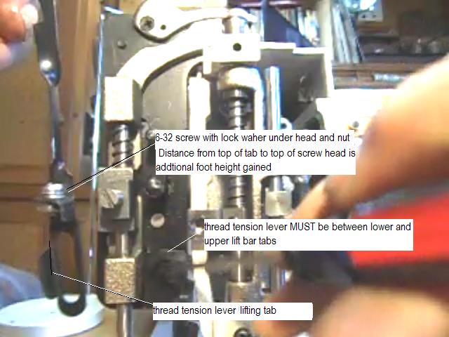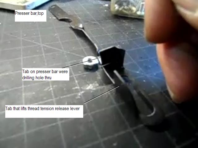 Simple mod to more easily slide thick material under foot. Not a lot of detail but seen on video where a simple screw is used to decrease space between lift bar and presser bar actuator, or so it engages sooner to lift higher. Only difference in my mod is I removed the lift bar to drill-the video I found he used a self tapping screw (but no details how ) FYI on my parts manual for the CP206RL item #3 W026 'lift bar' is the part being modified. item #18 W084 'presser bar actuator' is removed temporarily for easier access