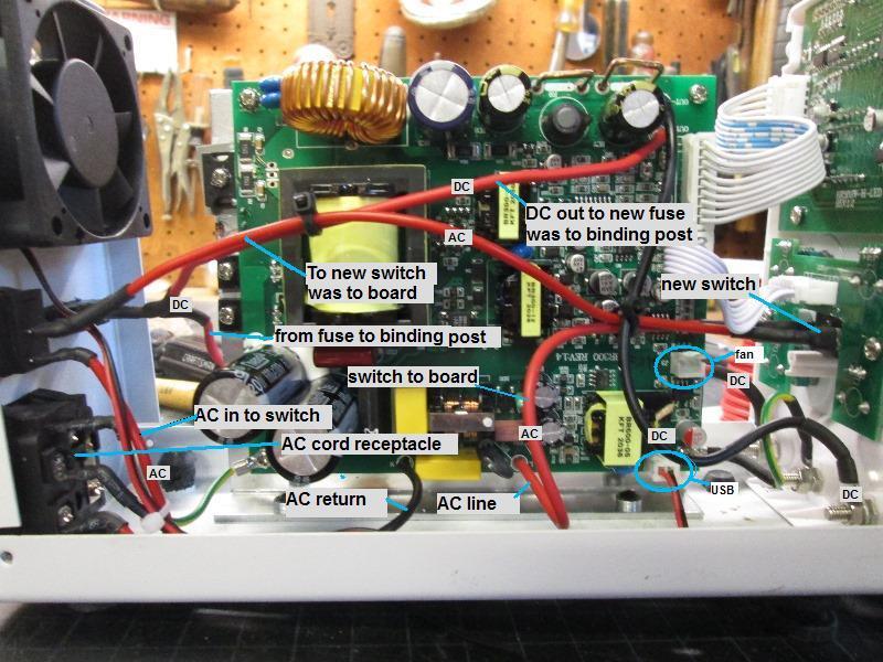 Main power switch moved to side. Not optimum but power switch on the side still easier than rear. Mounted on the bottom flange so cover can be removed. The DC output switch doesn't stop output, only disconnects the positive binding pos (meter still shows voltage but post immediately off). TBD I may reinstall the USB IF I can unsolder case from its board. Insert thru metal cover and resolder board. IF I can unsolder and install usb I may add a 3way switch from the usb port and add a small 0.15 amp HD fan. Switch USB or constant fan if running high loads. That's a big maybe. I don't really need another USB charger but If I can why not. The fan addition I will do. Whether on 3 way switch or just on/off if usb install fails.