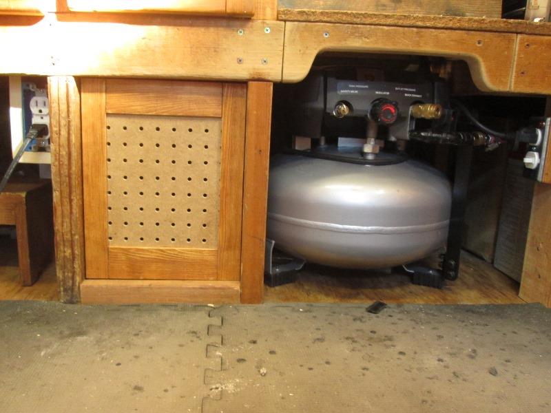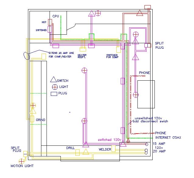 So just disconnect above plug from switched line and connect to the new always hot line. Ran new wire from before main switch, shown red, converting existing CPU plug to always hot.. Also disconnect branch line that fed outside plug from switched line and an tied to new hot line. Few gotchas, the newly converted plug that power supply & computer are plugged into there is several other things plugged in that don't need to be or want hot. Second the branch that feeds truck charger plug also feed couple of lights (though I didn't realize until later). So now we have a whole bunch of stuff on the unswitched line. Just more stuff to check and turn off-maybe its ok. First night Margaret went to shut down shop and the over head light stayed on. She comes in ? one of the shop lights wont turn off? Oh-I simply hadn't checked, they are downstream from the moved outside plug. I had remembered the overhead lights branching off before the outside plug. doh And then the electric heater on the 20 amp circuit. Decided it would be better to move electric heater to off the 15 amp line. So added receptacle for it. Next morning coming out to shop noted the heaters indicator light is on...hmmm. If the heaters switch were left on means it could have run all night- Not shown but outside motion light is tied into outside grinder plug so I can no longer turn that circuit off either. The 20 amp circuit been want to change since I had added outside light, now even more motivation. The interior lights on top of unneeded stuff on hot line make redoing worth while. First the 15 amp circuit.