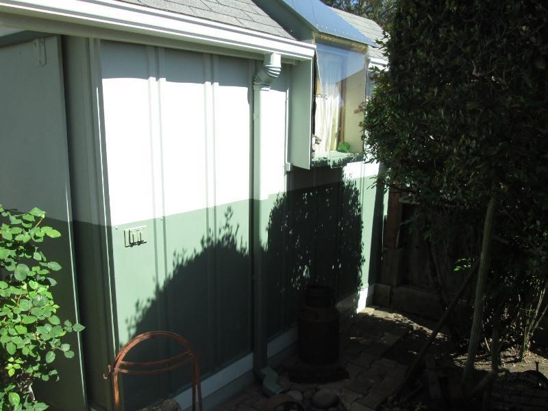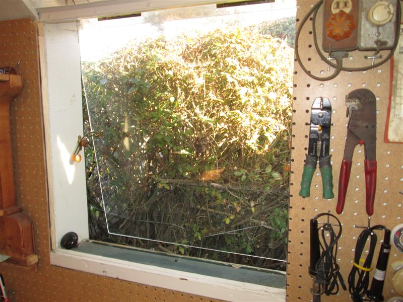 The one behind this one even taller. These are 40+ years old. Working in the yard I recently cut both of em to a manageable level and gain some view/light from window. Walked in side to see what view I gained out window-hmmm. Having never been able to see past bushes amazing and weird. Added light in shop nice. However my neighbors porch looks right into shop. At night I often am standing at this window with lights a blazing. The large bush furthest away I want to cut down even more. But just feel pretty conspicuous at night-even folks walking down the street. Just odd, didn't realize how exposed window would be cutting back bush.