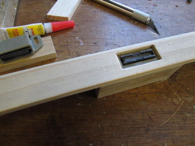 Simple corner moulding cover (right latch upside down). Once I had holes cut realized no way to place catches on sill and expect to line up with holes in trim. Remembered folks using crazy glue on wood so used to place. Insert catch thru cover, glue on block pushing both inside face of moulding to locate catches on blocks. Then put glue on the blocks and used trim set on sill to place.