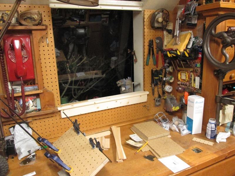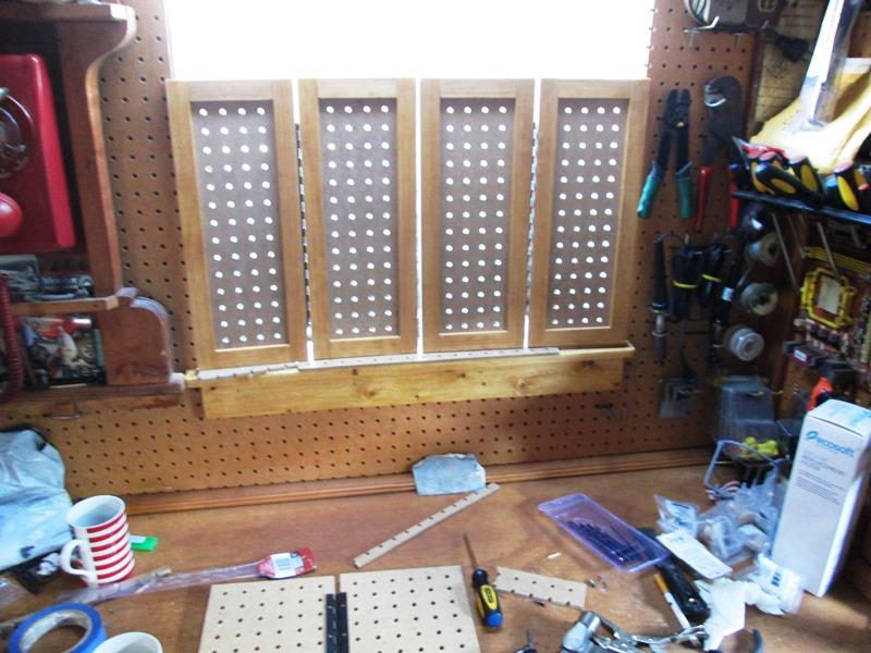 So decided to make bifold shutters matching new window. Could use existing curtain but shutters I can split. Top shutters about 8" tall and bottom row 16". Can have bottom open for air see outside, likely rarely close but the top probably close night. Picked up some 1 1/8" x 1/4" lattice for shutter 'frame'. 1x 3 for sill. Shutter panels will be full peg board with lattice false or face frame. I did this on last set for new window and worked well. All of the shop cabinet doors are routed and pegboard slipped in frame. Stapling fake frame to surface of pegboard a lot simpler. This window was cut in years ago. As I'm not going to face existing frame also decided not to trim, mount shutter panels directly to wall. When pegboard was added to walls it was just butted up to existing sill which ended up flush and pretty rough. Going to cover it. So that would be first. Make sill, then measure what I end with.