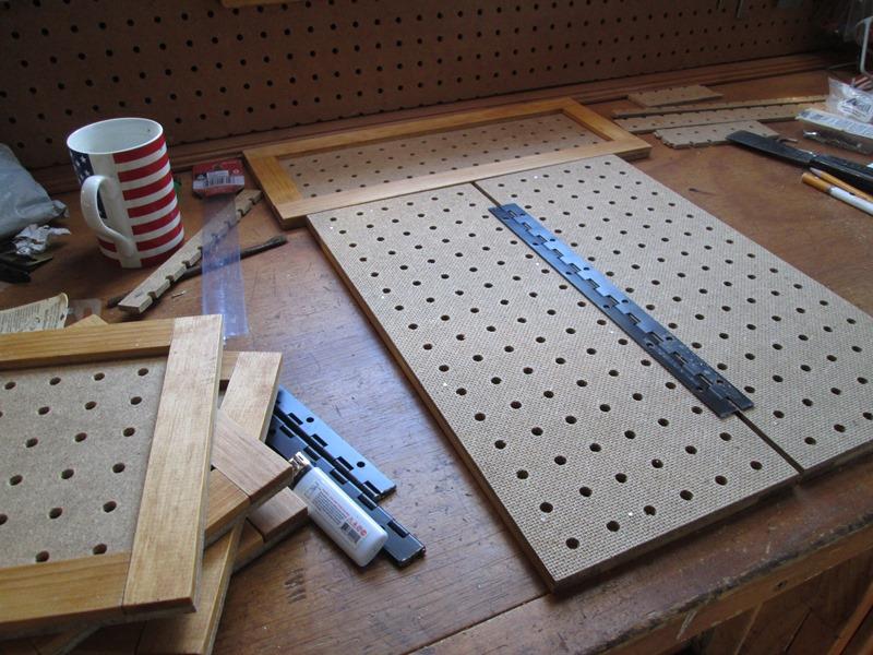 Cut all the pegboard panels, pieces for lower frames. Top panels holding off cutting vertical frame pieces. Make the lower doors and verify before making the uppers in case I need to adjust.