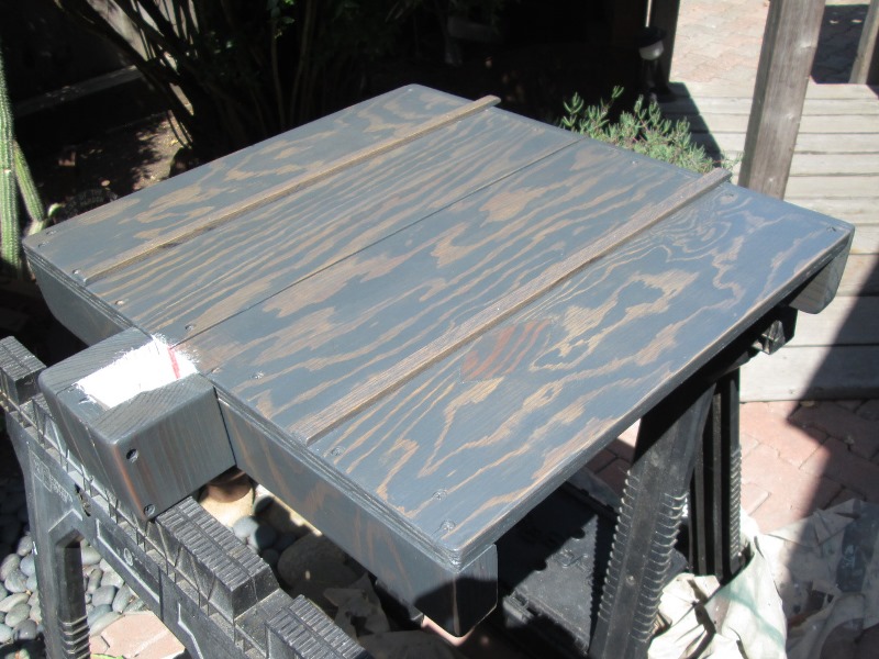 Hadn't planned on documenting, so no details in construction. Here it is finished, stained and drying. A piece of 3/4" plywood. At the back or top fence is piece of 2x4 that holds to halves together once panel split on saw. Its only function is that. At the front is the fence that material is cut against. It also holds 2 halves of panel together once cut but its function is critical, holding materials square to saw blade. The procedure is building sled but the front fence is not permanently attached until panel is run the saw and verify it is square to cut. Simply adding screw to both ends, cut. check square. If needed remove 1 end screw, pivot fence needed amount. Replace screw in new hole and check again. Note once panel is cut the slot will not change, your only pivoting the fence until it is square to it and blade Many very good videos outlining how to verify material cut is square. No- it is not a single cut and checking with framing square. The more time you spend here the more accurate your sled will be. Once you believe its square fully screw fence. You can add as many features, stops, clamps etc as you want.