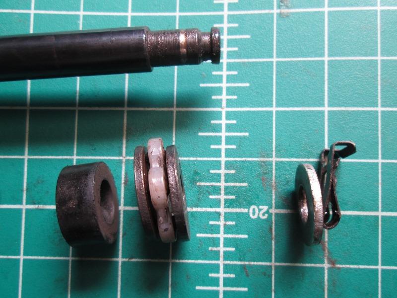 Should be obvious but when removing from tubes ensure all the pieces come out. Rubber cushion goes on then washer, bearing, another washer. Insert into tube, then washer and the clip to retain.