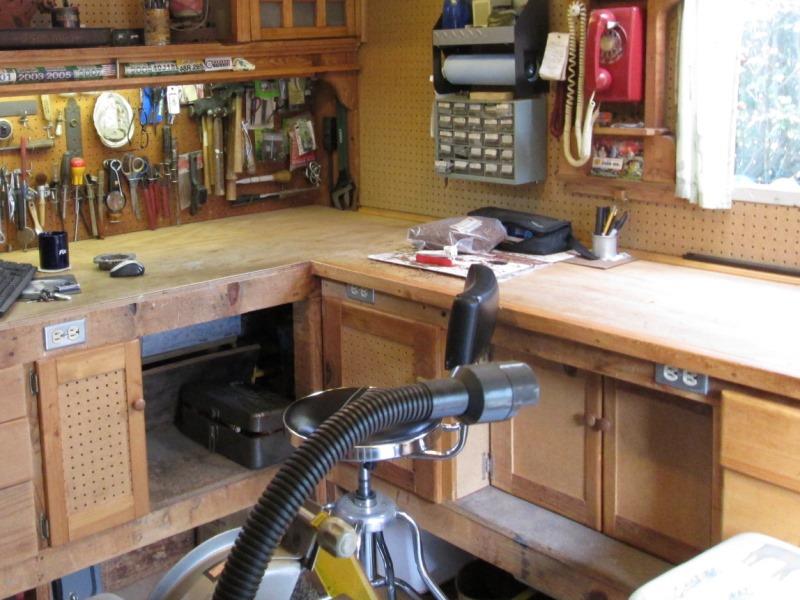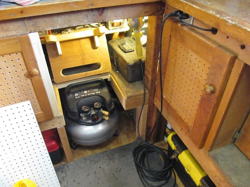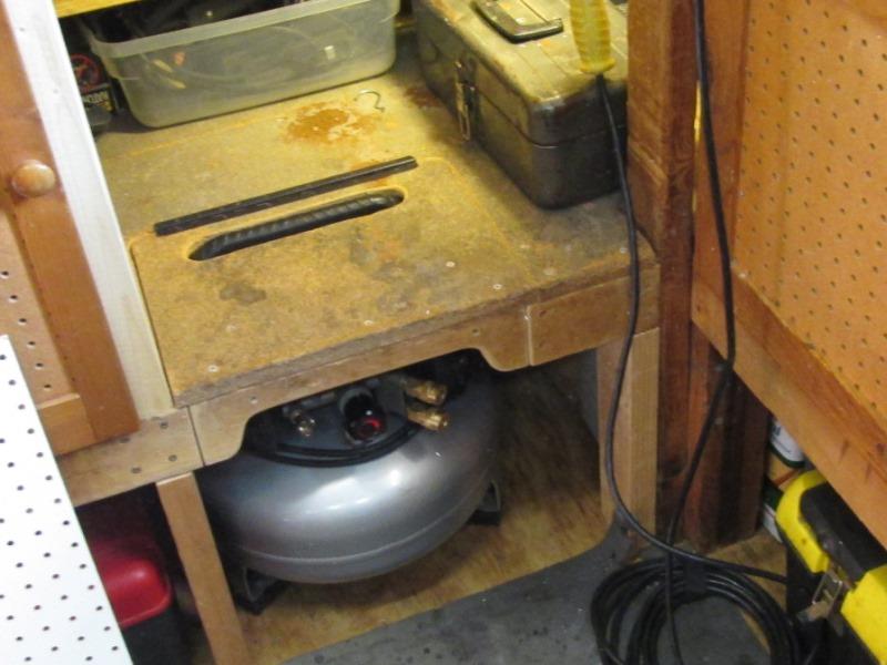 It lives in a lean to just outside shop next to sink, most air needs (cutting/grinding cleaning) are done outside and has worked well. For those occasional needs to run inside shop kind of a pain. Hose draped across deck and inside shop either tripping- getting tangled in cords-just doesn't work. Having air inside for light use would be awesome. So revisited at what it would take to store in shop. Where to put Modify workbench![]() There are only 2 options, on floor under shelf either at front bench or at the side under the vise. Though I seriously considered removing the compressors handle so it would slide under shelf anywhere, that would defeat its portability. I also considered making a handle that didn't stand as tall, then notch the shelf support 2x4 so compressor would fit. That left as only option under the front shelf as the 3 drawers under vise have a lot of weight and the support cant be cut.