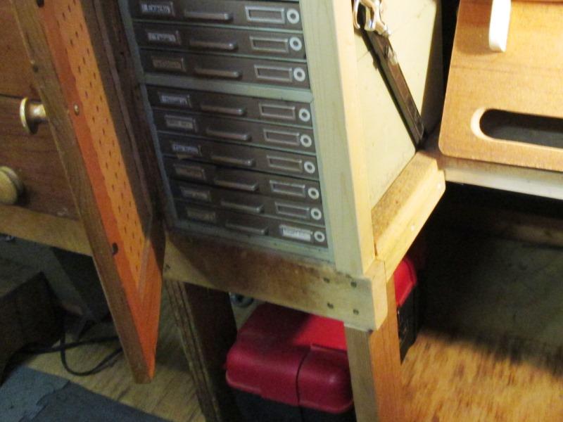 Adding shelf under drawer cabinet would tie the legs so cant move, also be easier to access the air tool box. Make matching door. Modifying the compressor Add bench Q/C
