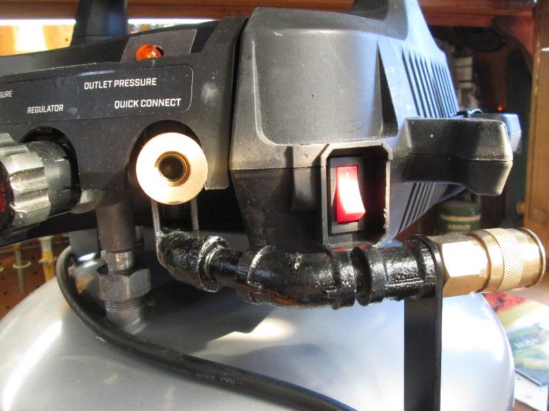 For the routed hose that plugs into compressor, relocated lower outlet. Used a few fittings to point to side. Also added pilot light denoting compressor switch in on (auto) position.