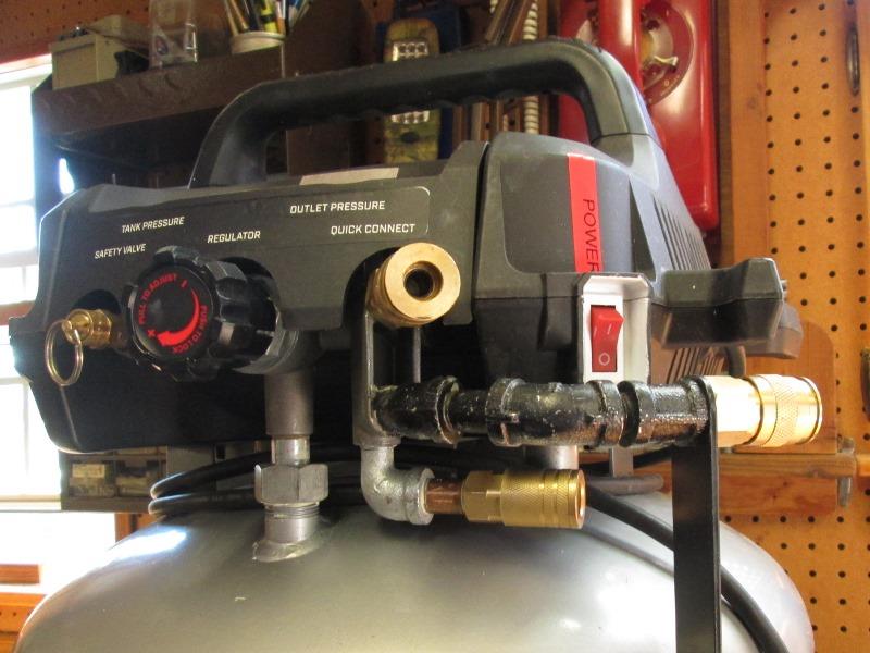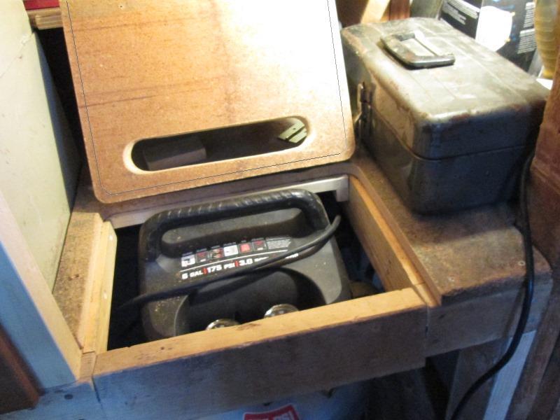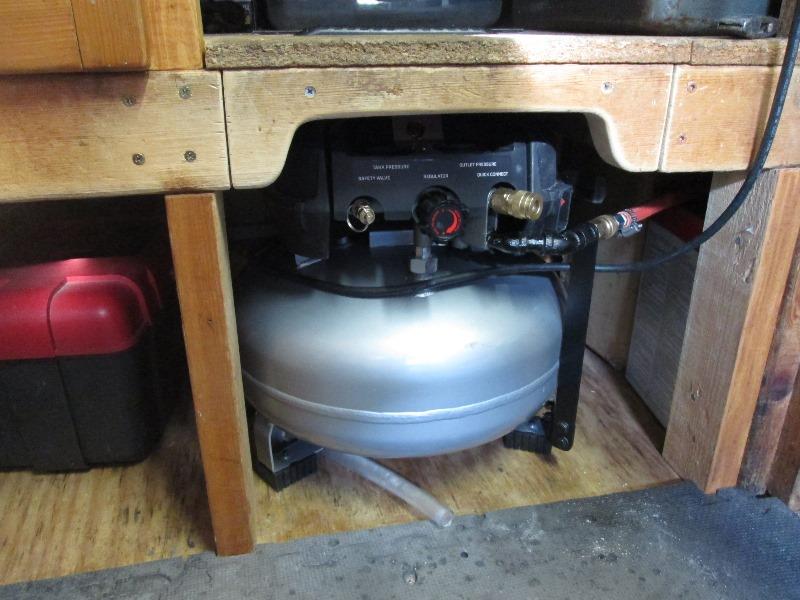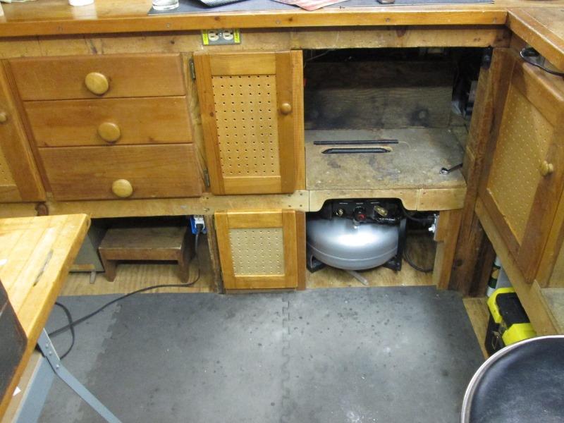 All in all pretty happy although just using and storing the compressor ended up a 3 day on/off exercise. Not planned but resultant switch receptacle for compressor, a floor level receptacle that's tucked back out the way -both on 20 amp circuit. Useable 'hidden' place for storage. Air quick coupler at bench... Kind of fun...Just amazing what was intended just sliding under bench and what i ended up being doing to accomplish... Yet to do is add handle to new door. Drain relocationAll I can address is valve on side. I am going to add elbow and nipple to relocate drain valve toward front.