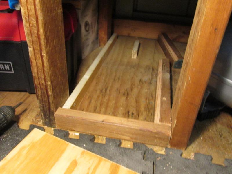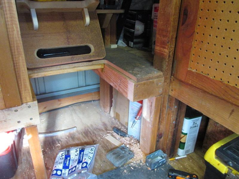 So 20 minute receptacle addition took a good 8 hours. Now that its done.. works slick just reach down and flick the switch. Added pilot light. 2nd tieing bottom of added leg.![]() Using 2x2 between new and old legs to support side to side. Front to back using another 2x2. screwed to each other and floor. Add cut 1x2 on opposite side. 2x2s are cut with notch for planned plywood to set flush.