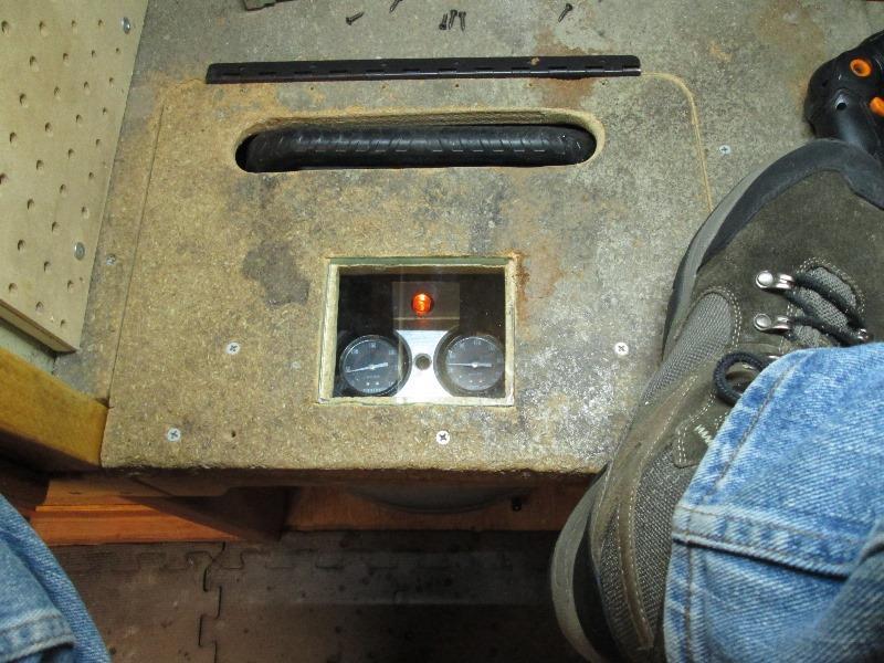 Remove shelf, cut approx 3 1/2"x 4" hole. Then cut a piece of 1/4" glass to 4" x 4 1/2". Traced glass center over hole and cut recess 1/4" deep for glass to set flush. Nice! Pilot and gauges visible.