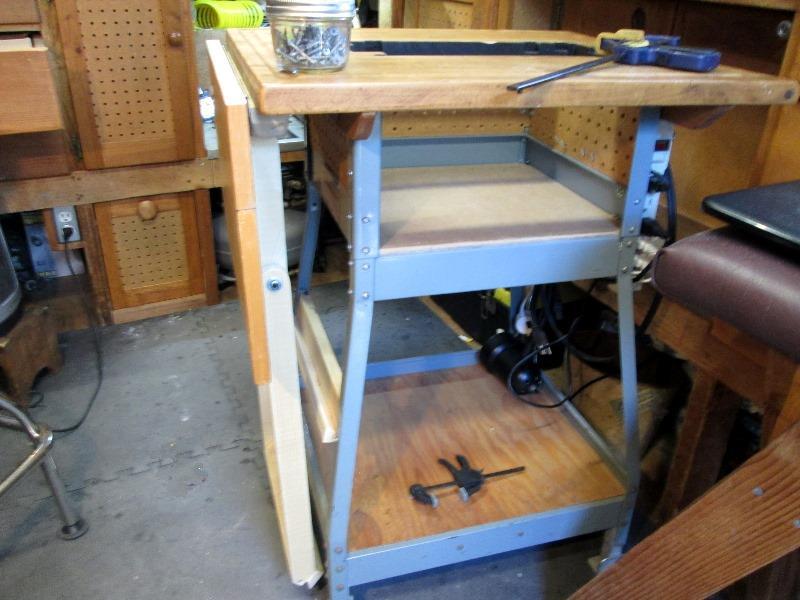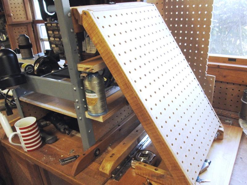 To add full backing to legs it could only cover distance from where legs contact leaf in dropped position. Or recessed into legs for full length to still fold flat. The only restraint as far as adding shelves is when the leaf dropped. Shelves could extend no more than 3" from table. Spools are less than 3" in diameter so that would work, at 5" tall might get 2 shelves. It was raising & lowering table leaf eyeballing shelf addition and leg backing is when I noted how much the pivot bolts were wiggling in holes.
