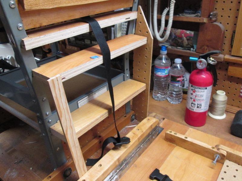 Details: 1.)Finalizing leaf addition to table I had noted area behind leaf support legs at side of table under leaf. Occurred to me I could make some small shelves to store thread spools and other small items, freeing up space on tables main shelf.