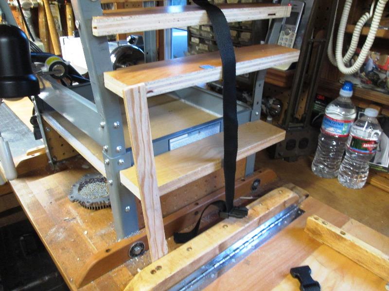 Decided to use full backing on the legs. Opted to use pegboard. As leaf support only pivots to 30° from vertical hooks will not fall off, allows hanging small bags of supplies. Either side of pegboard can be utilized. Removed the legs and cut 1/4x1/4 notch on inside corners so backing sets flush. And back on shelves... Still upside down. Picked up 6' of 1" lattice, will give 1/4" lip on shelves and help keep stuff from walking off.