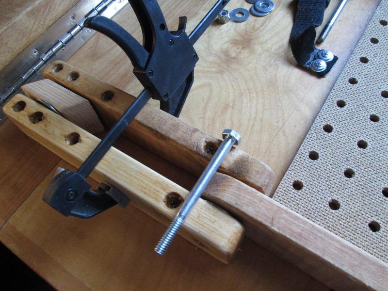 Made pivot supports. Clamped to inside of existing blocks to drill thru holes. Then clamped to outside of legs with inside supports and fender washers in place. Add small scrap at other end to keep parallel also with fender washers. Glue and screwed to leaf. Picked up some 3" bolts perfect shoulder length, need to cut off bout 3/8 of thread.