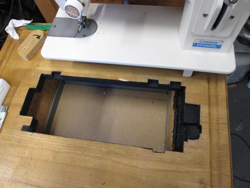 This H/F table was seriously modified few years back, adding power strip, casters and butcher block top and other details to use as portable workstation. Recently acquired a Consew CP206RL walking foot semi industrial sewing machine. I was going to cut hole in my work bench to mount but this table as handy as it is isn't used all that much. Would be perfect for the sewing machine. Dedicated space I wouldn't have to cut workbench which isn't an issue but machine would need to be removed when I need the workbench surface. Modifying this table would be a lot simpler and be permanent station for using sewing machine.