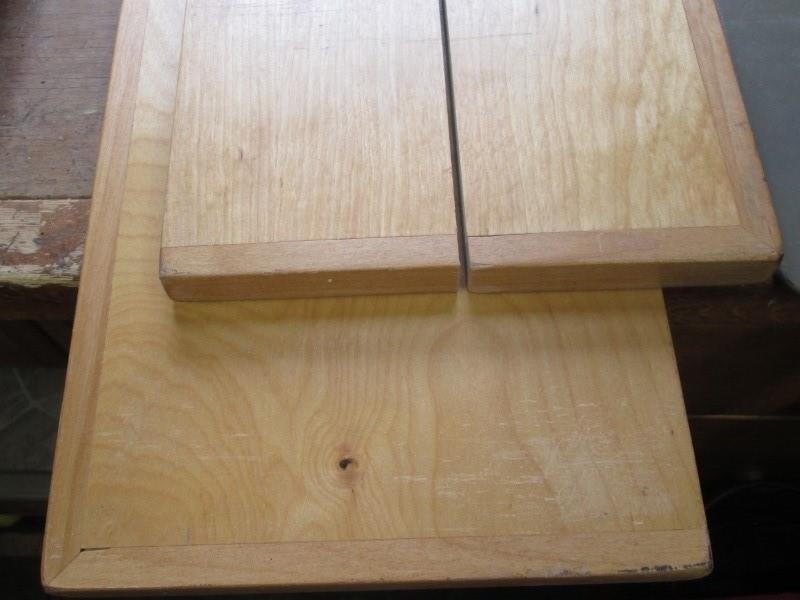 To get leaf wider than boards 8" and have the banding wrap I cut 20", width of table, off each end. Then cut one to 4" wide so leaf will be 12" wide. Table placed upside down on work bench.