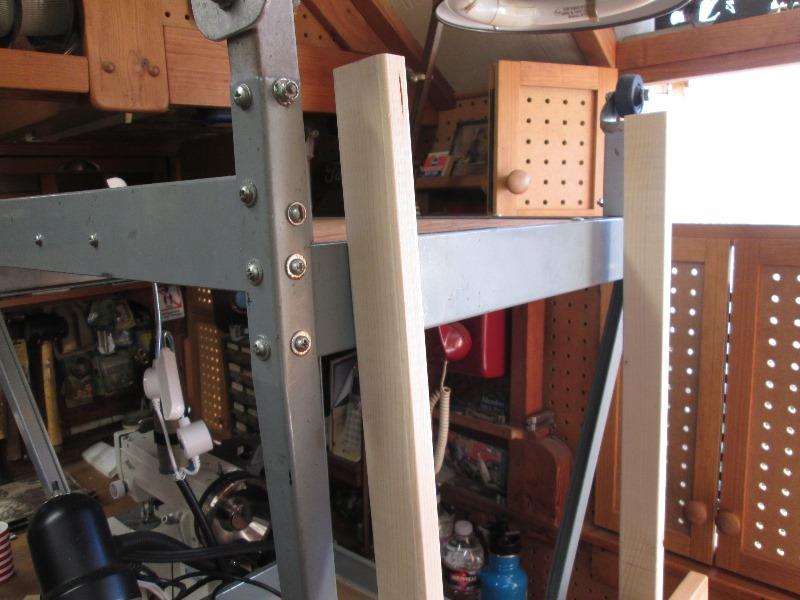 Next.... Reason is I had planned to staple large piece of 1/8" ply to leaf legs for stability. But Im seeing, as legs are either vertical or at 30° and there is few inches between legs and table in leaf down position, could use this for storage. So another project. Cut a relief into inside corner of legs so that a full length of pegboard can be flush mounted to legs. To side of table add some shelves. But as mentioned another project. Put machine back together.