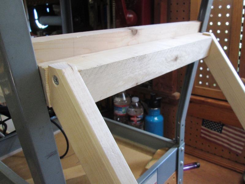 IT WORKS! Back cutting the 2x2 on the table saw was a real challenge but got it. 45° cleat, cut the 1x2 stop also 45°. Cut 1x4 spreader to fit inside the table legs. Glue & staple the 1x2 cleat to table spreader. Clamped the leaf legs in upright position, place the table spreader with cleat engaged and screwed thru table legs into spreader. Slid table off workbench and sat on floor