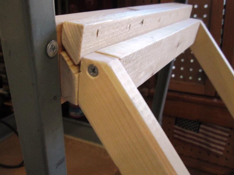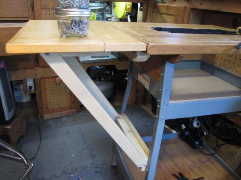 Pondering how to hold leaf open. Looking around on line found several making their own drop leave supports. Mostly under tool table/ garage folding work bench etc. Leaning toward something like this.
