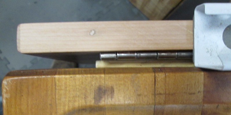 But we have 12" of added table workspace! It can be dropped so takes up no extra space in shop. Details TBD. I need to replace the all thread leg pivot bolts with shouldered bolts. Make some simple stops so when leaf raised into position they can be engaged so bumping legs cant jump out of cleat. The gap between leaf and table ended up excessive. Didn't realize working on table upside down the edge of table had been cut. Its neither straight, square or at 90°, why early on noted stuff out of square. Could just place some card stock in gap, reposition the hinge to close gap. Minor. Except I'm going to take apart. Re-cut the top square. Then reposition hinge.