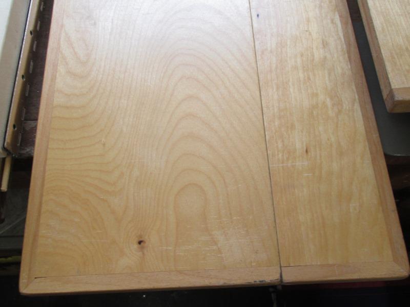 While the table serves its purpose it was obvious before I even finished that it really needed to be a bit larger to support material on the left side. Due to limited space drop leaf is the only practical solution. I've never built a drop leaf,and this modified Harbor Freight table doesn't really lend itself to adding leaf so its bumbling along and figure it out as I go. Few details to work out. Want leaf at least 10". Digging thru stuff on hand dont have anything as thick as table, 1 1/16". Looking at supports to hold leaf up, other than being pricey table top overhangs underneath structure about 4" so using a pre made folding bracket not a bolt on. Just a lot of stuff causing this to be something I wont whip out in couple of hours. Trying to formulate a plan, too many unknowns/obstacles simply confusing myself. Decided using materials I have on hand is just to start, make and attach the leaf. Then figure out how to support if I can. I'll identify and try to solve issues as discovered hopefully. Otherwise Ill never proceed. For the leaf I found an old pre made/finished shelf board. Veneered 3/4" plywood. Nice, I dont know what this was for or where it came from, been in the garage for years. Im using. Its 8' long, 8" wide x3/4" thick, banded on 3 sides with 1/2"x3/4" face board. Material I have 6' piece of 1x2", 2' of 1x4", about 5' of 2x2" and 23" piece of piano hinge.