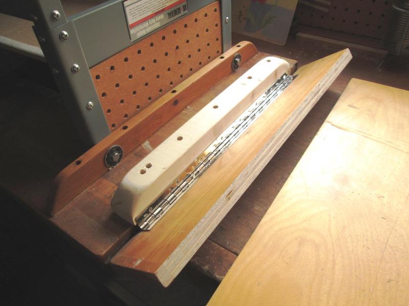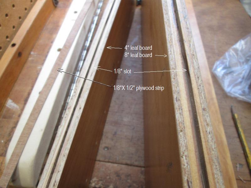 Joining, though gluing and screwing 1x2 braces underneath to leaf I want to ensure face is flush. I don't have accurate way to dowel but I do have vertical jig for table saw. So Ill run slot thru edge and join with continuous piece of 1/8" plywood. Then add support stringers underneath. But first before joining leaf halves is attaching to table. As leaf material is only 3/4" thick I thought I'd just add spacer between hinge and leaf. Issue is hinge holes end up right at joint of face band and plank of leaf. Orientating piano hinge at table edge was not working...