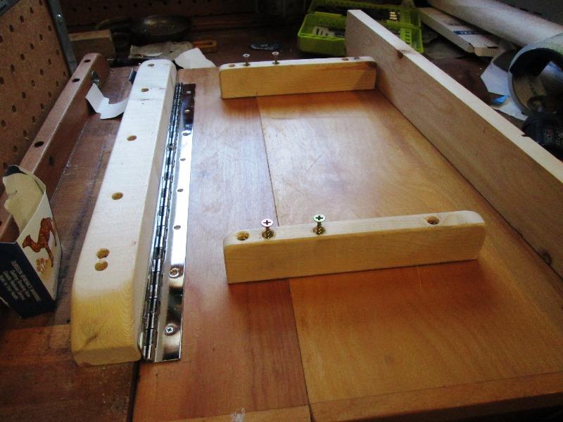 Originally on leaf support, if I dont come up with better idea, was to use sliding rods to hold leaf open. So planned 2x2 at edge for rods to go thru. Realized if I push out 2x2 over edge of table it would push the hinge holes onto plywood instead of face band. I could attach hinge on face of 2x2.