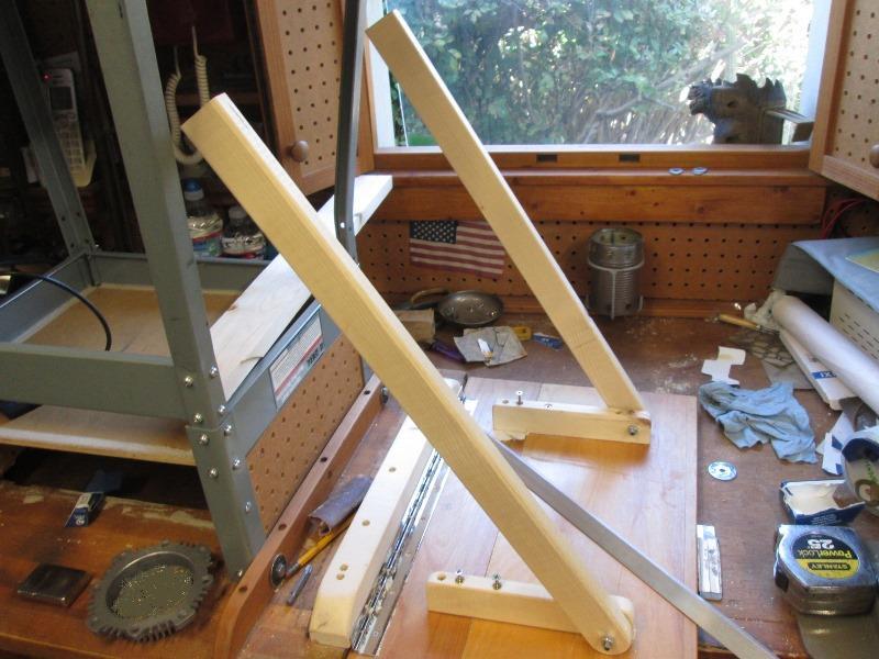 When leaf dropped end of legs will be about 2" from floor. At this point, verifying legs dont extend beyond table legs, discovered left side of table top isn't square to side of table. hmmmm... Not sure when trying to layout how to capture support legs in raised position if this is going to further complicate. (Much later, once table was done& flipped back onto its feet discovered the table top edge I was working off of had been cut-its neither square, straight or at 90°, why stuff off) As it is I'm stuck trying to make whatever captures the support legs. Thought this would be easy. More thought required. The angle of tables legs, leaf will not raise higher than level. It's the really locking once raised. If table could be lifted past level then it could drop into brace on table. Like a french cleat. But it wont and not remaking hinge.