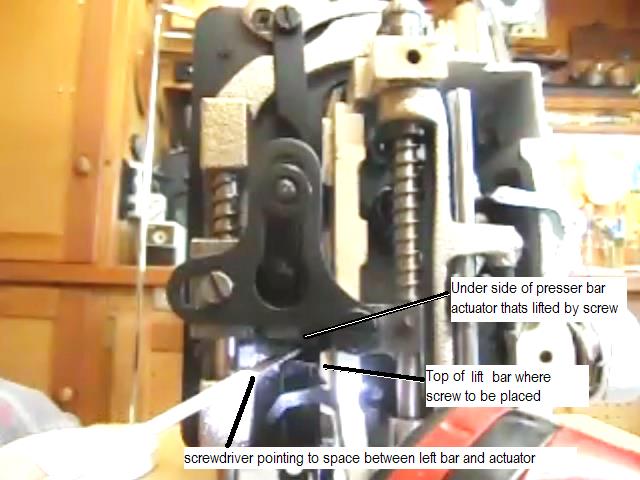 The actuator plate is removed for simple access to remove the lift bar. Once screws removed slightly rotate bar out from behind thread lever.