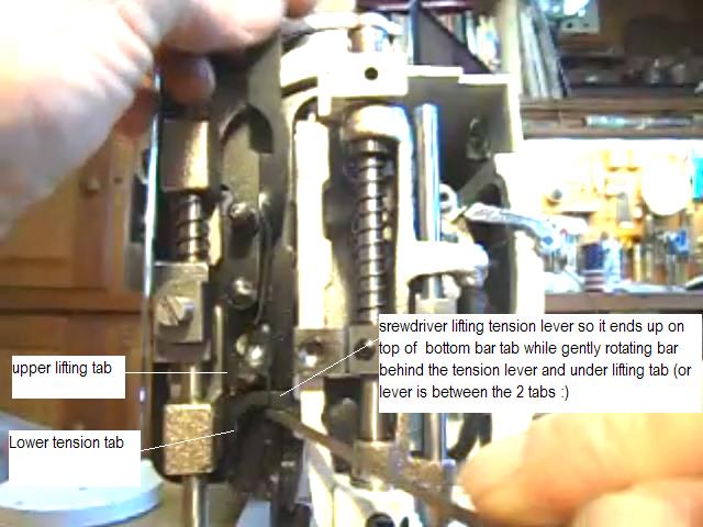 Replacing drop in from top, slight rotating to get behind the tension lever. Tension lever must be between the 2 tabs. Reinstall top screw thru bar with flat washers between bar and lift lever/handle. reinstall bottom screw thru bar slot. Reinstall larger screw thru pressure bar actuator.