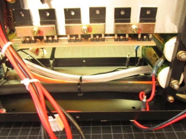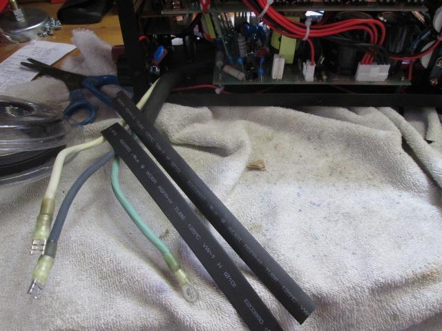 As rather stiff to make bottom turn split the outside sheath down to where cord turns up. Left about 4" of split sheath and will zip tie. Split will face inside, this is to have sheath between case front and cord. Just to make sure slipping tube over hot leads up to spades, shrink to spades but leave lower loose. Used some self sealing crimp terminals. These are nice, supplied with shrink tube but has an adhesive that also bonds to wire sheath.