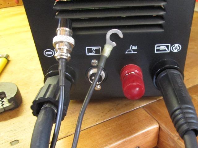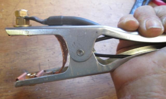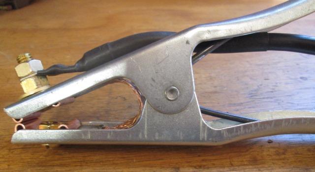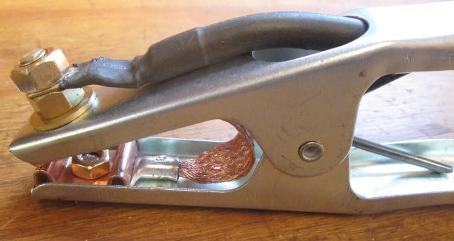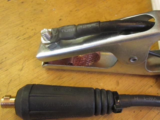 Removed the bolt only to find the strap doesn't have ends, pinched under clamp ends. What the heck. Already close to edge so cant do anything with it. Next time at auto parts Ill pick up a 4"strap and replace. Funny how easily and fast unravels. Funnier are the off center nuts. At the machine end nice connector, but as else where cable totally unrestrained. Outer rubber slides back, added some tube, zipped for now. Unsure if Ill replace the cable just because of expense. In theory work lead needs to be longer, in practice seems the ground clamp is always the restricting issue, always tripping over it cause cant put where out of the way.