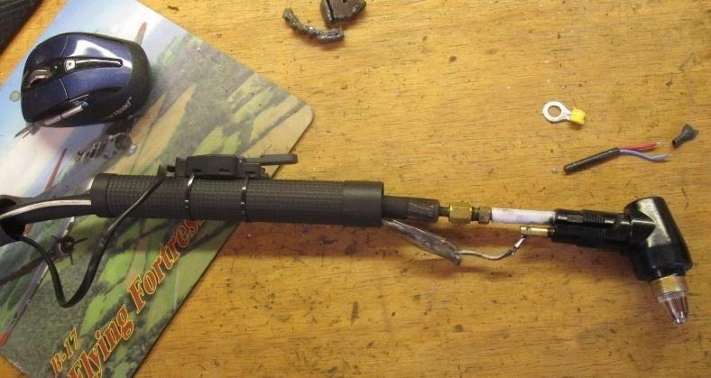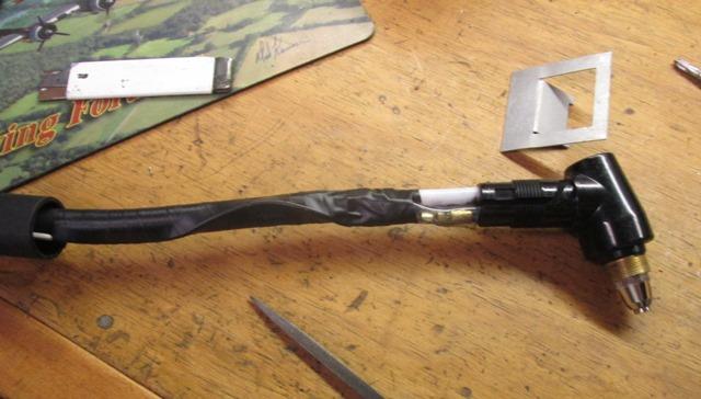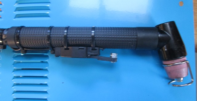 Reposition switch facing down and a little forward. A lot easier to hold. I added a 6-32 screw and couple of nuts to act as a stop in on position. The trigger can easily be snapped off as it reaches full travel but is about 1/4" away from handle. Simply sliding the sheath and outer piece of loose shrink tube back up the air line to allow enough room to unscrew the handle from torch head. Slide it back and check that screw!